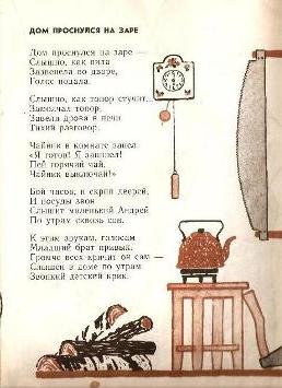 Дом проснулся на заре - Слышно, как пила Зазвенела во дворе, Голос подала. Слышно, как топор стучит... Замолчал топор, Завели дрова в печи Тихий разговор. Чайник в комнате запел: «Я готов! Я закипел! Пей горячий чай, Чайник выключай!» Бой часов, и скрип дверей, И посуды звон Слышит маленький Андрей По утрам сквозь сон. К этим звукам, голосам Младший брат привык. Громче всех кричит он сам - Слышен в доме по утрам Звонкий детский крик.