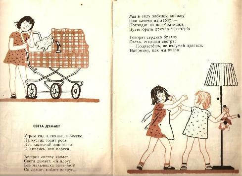 Утром сад в сиянье, в блеске, На кустах горит роса, Над коляской занавески Поднялись, как паруса. Ветерок листву качает. Света думает: «А вдруг Всё мальчишка замечает? Он лежит, глядит вокруг... Мы в саду забудем книжку Или влезем на забор - Поглядит на нас братишка, Будет брать пример с сестер!» Говорит сердито братцу Света, старшая сестра: - Подрастешь, не вздумай драться, Например, как мы вчера!